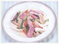 四、鍋中放油,放入山藥、少許水,略炒片刻再放入肉片、蔥段